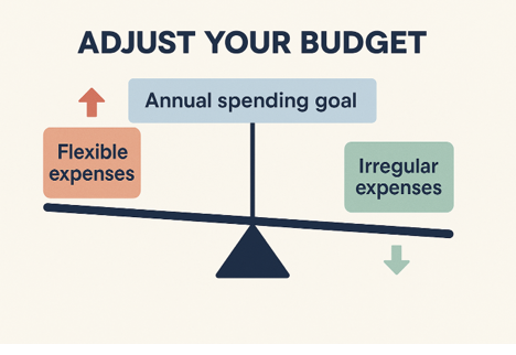 Your budget is a living and breathing document. It’s not set in stone. You can move things around and make the necessary adjustments as life happens so you can hit your annual spending target.